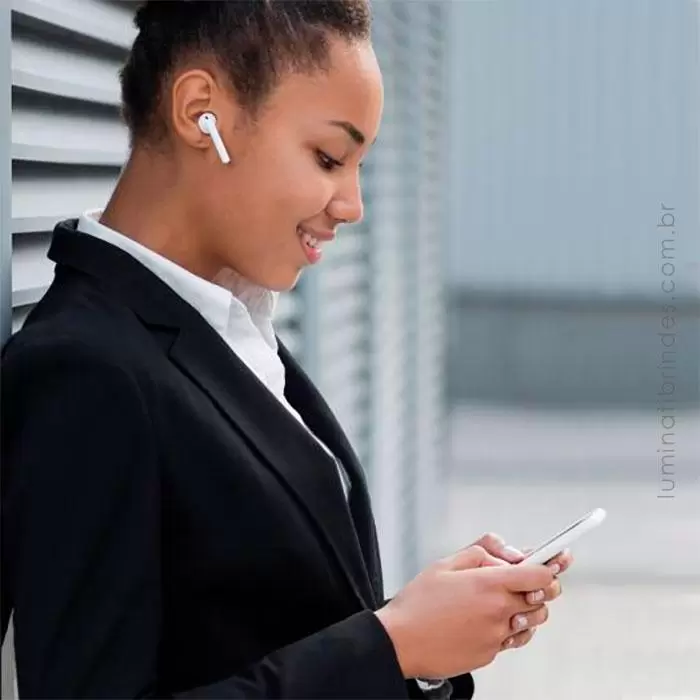 O Airpod Earfone Bluetooth com estojo carregador é um dispositivo com excelente qualidade de áudio e um poderoso circuito de cancelamento de ruído. Funciona através de conexão sem fios, Bluetooth 5.0, ideal para atender ligações, fazer videoconferências, ouvir músicas e outras funcionalidades como comando de voz, controle de volume e microfone. Possui bateria com autonomia de 6 à 8h, touch com multifunção e alcance de até 10 metros! Liberdade total de movimentos, sem se preocupar com fios. Carregamento em tempo aproximado de 2h. através do estojo, que acompanha o produto. Grave a marca da sua empresa com os brindes tecnológicos da Luminati.