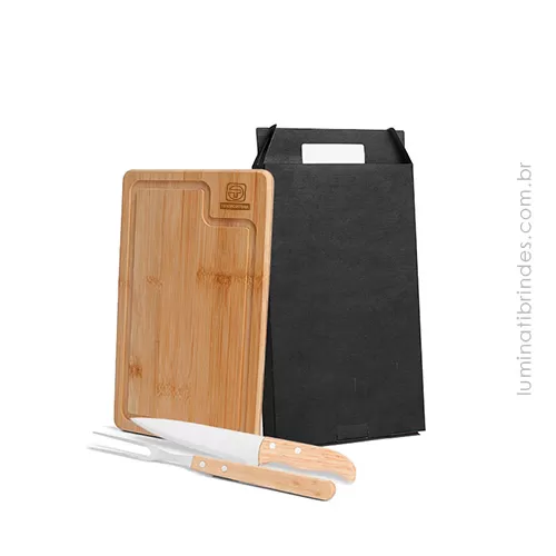 Kit Churrasco Beef da Luminati Brindes para personalizar com 01 Garfo, 01 Faca com cabo de madeira, 01 Tábua de ótima qualidade e embalagem para presentear de maneira especial! Surpreenda seus clientes com um Brinde Gourmet da Luminati.