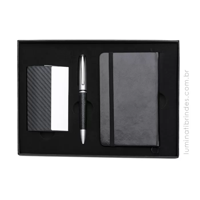 Kit Premium Business personalizado com porta cartões em couro sintético e detalhes brilhantes texturizados; caneta esferográfica de metal fosco com parte emborrachada preta; caderno em couro sintético com 80 folhas pautadas amarelas. Kit executivo compacto perfeito para o cotidiano empresarial. Personalize e dê um presente com a cara da sua marca!