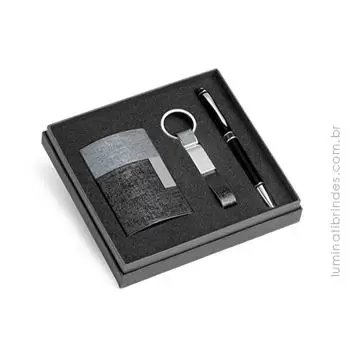 Kit Executivo Verano clássico com 1 porta cartões, 1 chaveiro de metal e couro sintético e 1 caneta esferográfica com ponteira soft para manusear telas sensíveis ao touch screen. Kit Executivo elegante e muito útil no dia a dia: organize cartões, prenda chaves e mude o jeito de usar celulares e tablets! Grave a marca sua empresa e dê um Kit Executivo Verano de presente!