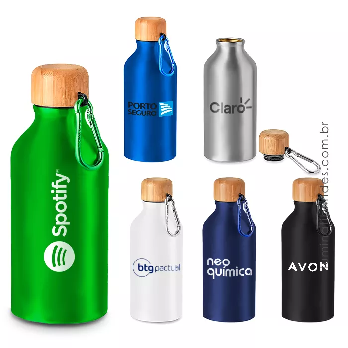 Garrafa Bios Alumínio, disponível em diferentes cores para personalização. Tampa de rosquear em bambu com carabiner. Capacidade de até 400ml, a Garrafa Bios é uma excelente opção para manter seus colaboradores hidratados durante o trabalho ou para presentear clientes e parceiros de negócios. Surpreenda com esta garrafa e colabore com meio ambiente reutilizando este brinde.
